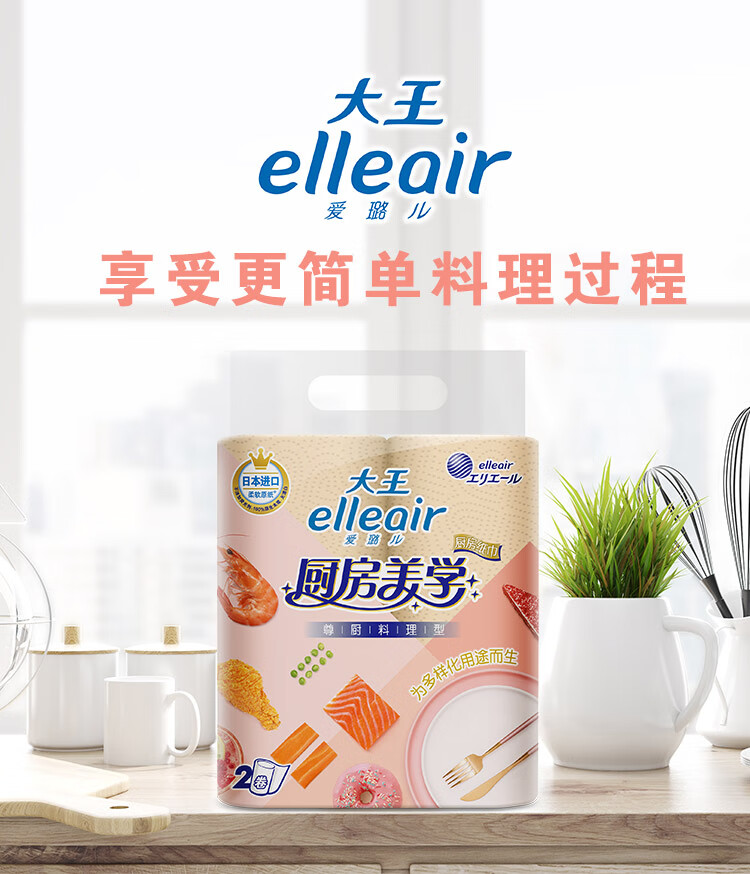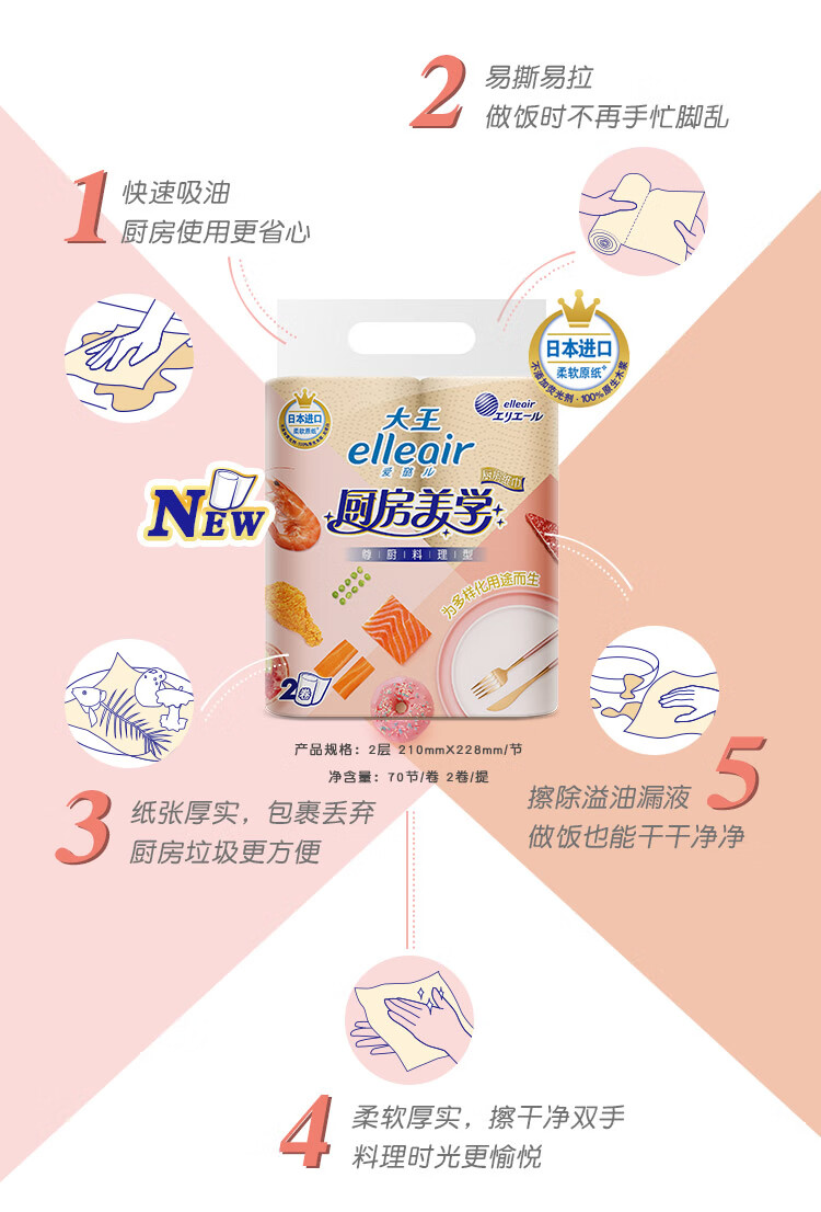 大王爱璐儿Elleair厨房纸巾厨房美学系列尊厨料理型吸油纸吸水纸家用纸巾70节*2卷现货